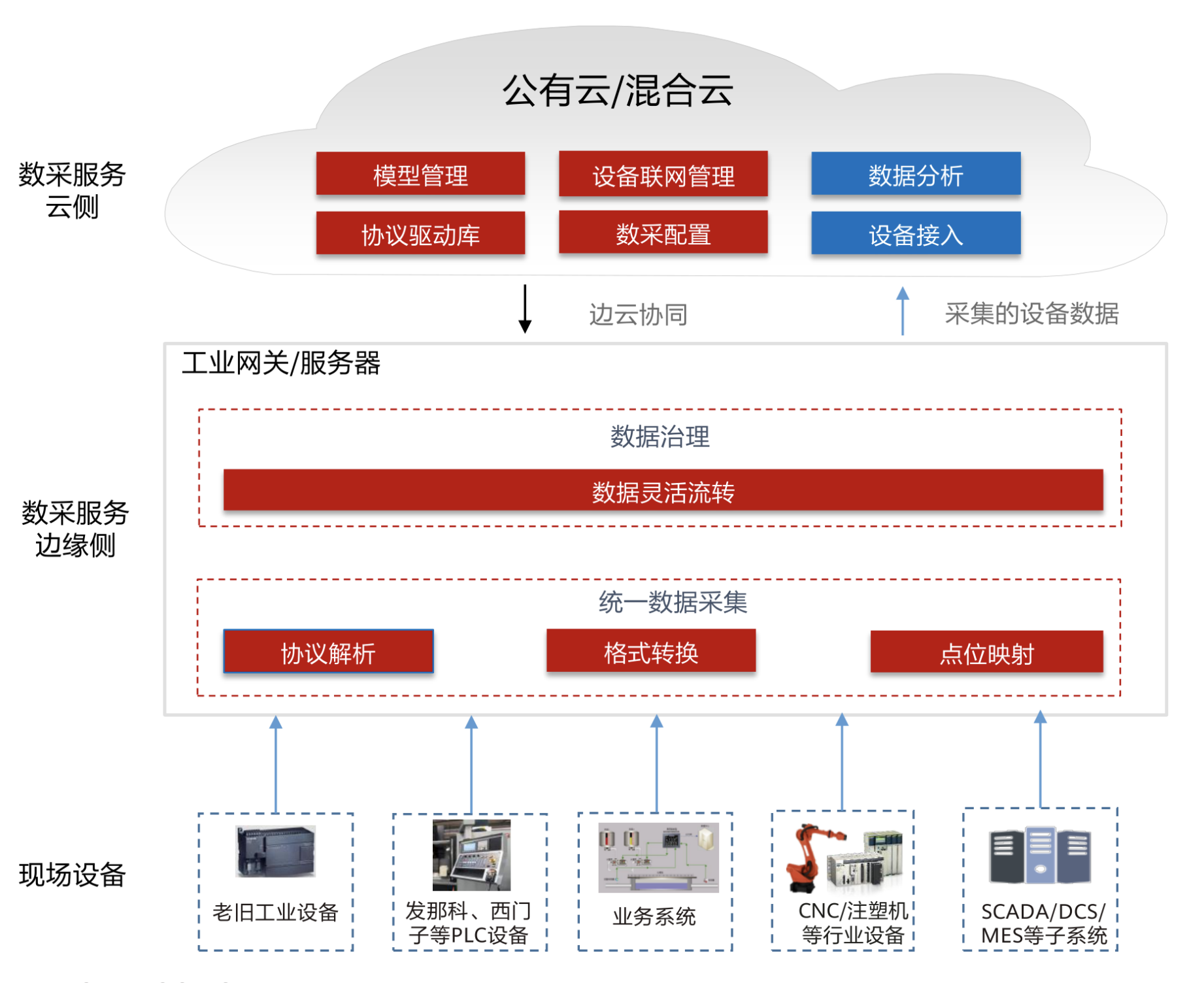 - 在客户现场提供数据采集能力,把工业设备按协议采集