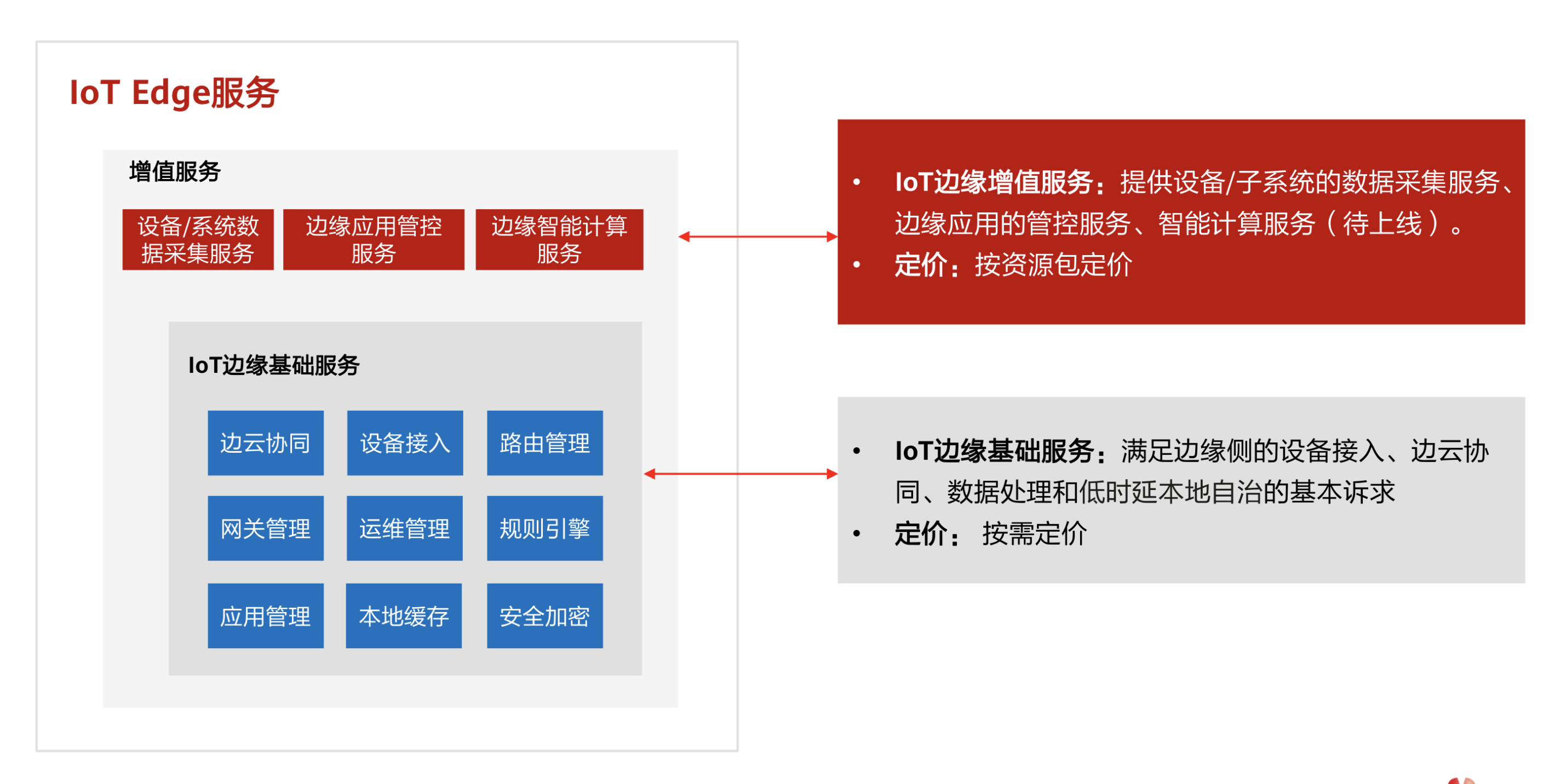 - 基础服务包括满足边缘侧的设备接入、边云协同、数据处理和低时延本地自治的基本诉求,按需定价;