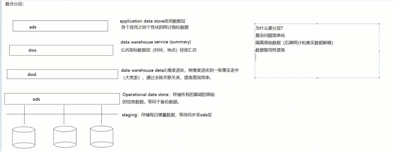 数仓:是面向分析,存储的是历史数据,数据可能会存在大量冗余,但是利于多个维度查询,可以为决策者提供更多观察角度。(数据之间不能互相访问,即不同源,再将这个数据整合起来)