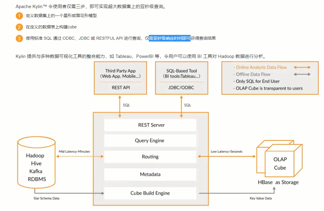 官网介绍:Apache Kylin™是一个开源的、分布式的分析型数据仓库,提供Hadoop/Spark 之上的 SQL 查询接口及多维分析(OLAP)能力以支持超大规模数据,最初由 eBay 开发并贡献至开源社区。它能在亚秒内查询巨大的表。