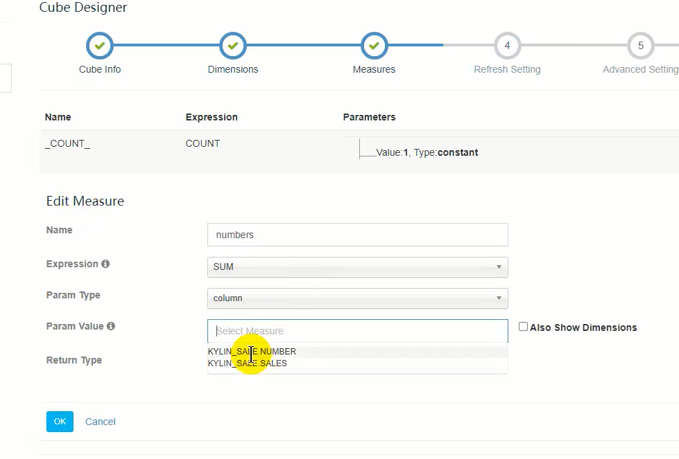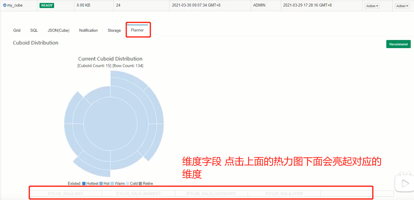 cube(立方体)是在确定好的维度和度量之后,会进行预计算,即将查询提前了,将所有设置好的维度和度量全部查出来放在Hbase中,使用的时候就直接使用,所以速度会非常快。(eg:维度A和B组成4种: A、B、AB、还有种就是0没有维度的情况,所以这种不用统计)