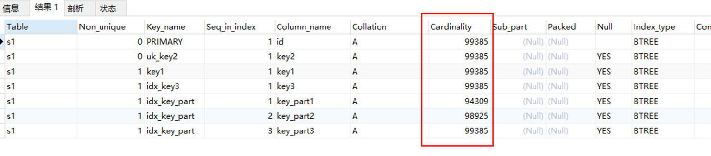 结合 show table status like “s1” 中的rows, 99385 / Cardinality 拿key2为例 代表 key2列的单个值重复次数,此处为1,意味着没有重复值,需要回表99385次