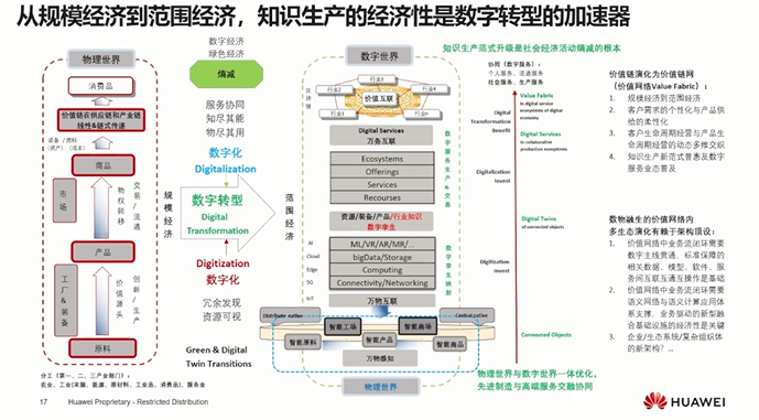 确立公司数字化转型战略和愿景:把数字世界带入华为,增强土地肥力,多打粮食。确立公司转型业务目标:在人力不显著增加的情况下,收入翻番。1转业务模式:围绕产品创新流、生产制造流、交易价值流的业务推进变革(知识生产与累积的动因与目的。2转组织:建立业务与IT融合组织,支撑长期战略(知识生产与累积的主体)3转平台:统一数字基础设施(知识生产平台&知识累积的载体)。华为自身数字化转型路径也是企业内在知识生产体系的架构、流程、装备、资产与工具演进的过程。