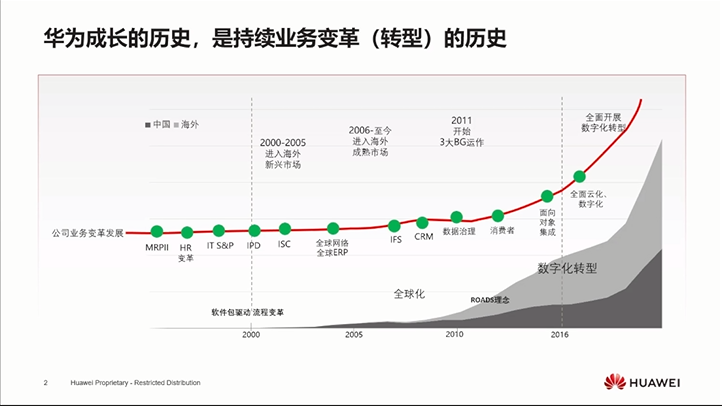 华为成长的历史,是持续业务变革(转型)的历史。华为转型最早是从1998年开始,当时已经渡过了企业的生存期。在公司发展势头很好的情况下,进行了一次主动变革软件包驱动流程变革,标志就是以客户为中心的集成产品开发流程变革。华为在2002年出现了历史上一次负增长,华为在这个关键时候,又进行了第二次变革,从国内市场走向全球化的变革。2005年出现了增长的缓慢期或叫平台期,华为此时在向移动终端和海外发达市场发起进攻。再往下2011年又是一个增长缓慢期,华为正式宣布从运营商市场向消费者市场和企业网转型,正式宣布终端BG和企业网BG成立,从原来B2B市场向B2b和B2C市场转型,进而全面进行数字化转型。