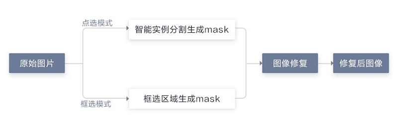 图像消除应用中提供了两种目标消除的方法:点选模式和框选模式,逻辑结构如下所示: