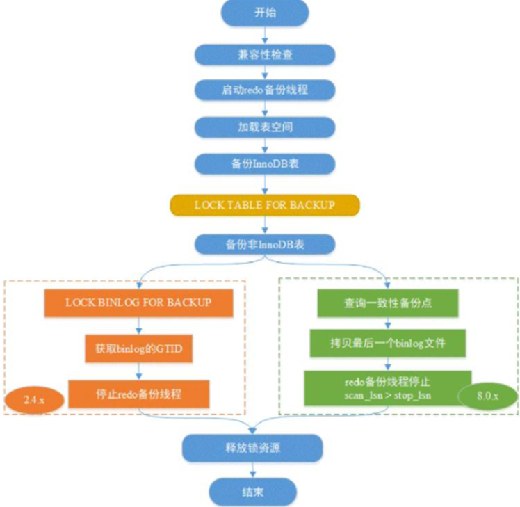 对于MySQL 8.0.x版本,Xtrabackup查询log_status时,MySQL服务器会分别对redo log, binlog等加轻量级锁,获取一致性的redo log LSN以及binlog的GTID;查询完备份一致点后,Xtrabackup会备份最后一个binlog文件,用于恢复时仲裁事务是否需要回滚;最后redo log备份线程任务会在其读取到的redo log的LSN大于查询到的备份一致性点的redo log LSN处停止