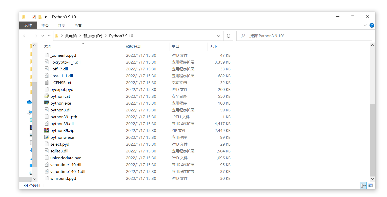 在D盘新建一个名为Python3.9.10的文件夹(你下载的版本可能与我不同,把文件夹名称按照下载的版本号修改,这是为了方便区分不同版本的Python),把下载好的压缩包中的文件解压到这个文件夹中