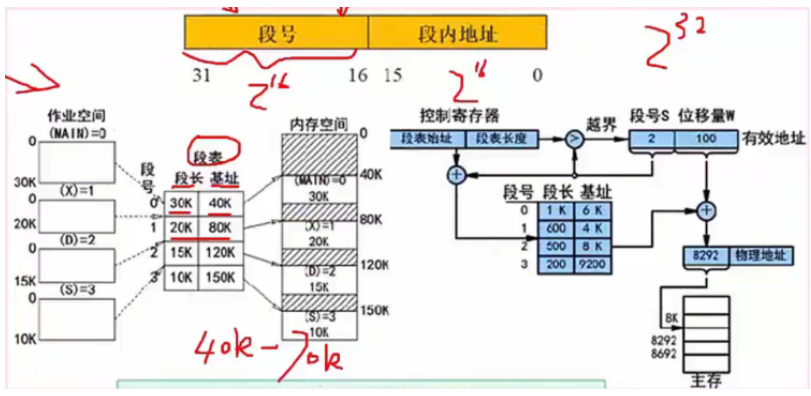 地址表示:(段号,段内偏移):其中段内偏移不能超过该段号对应的段长,否则越界错误,而此地址对应的真正内存地址应该是:段号对应的基地址+段内偏移