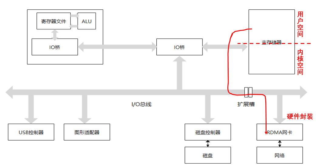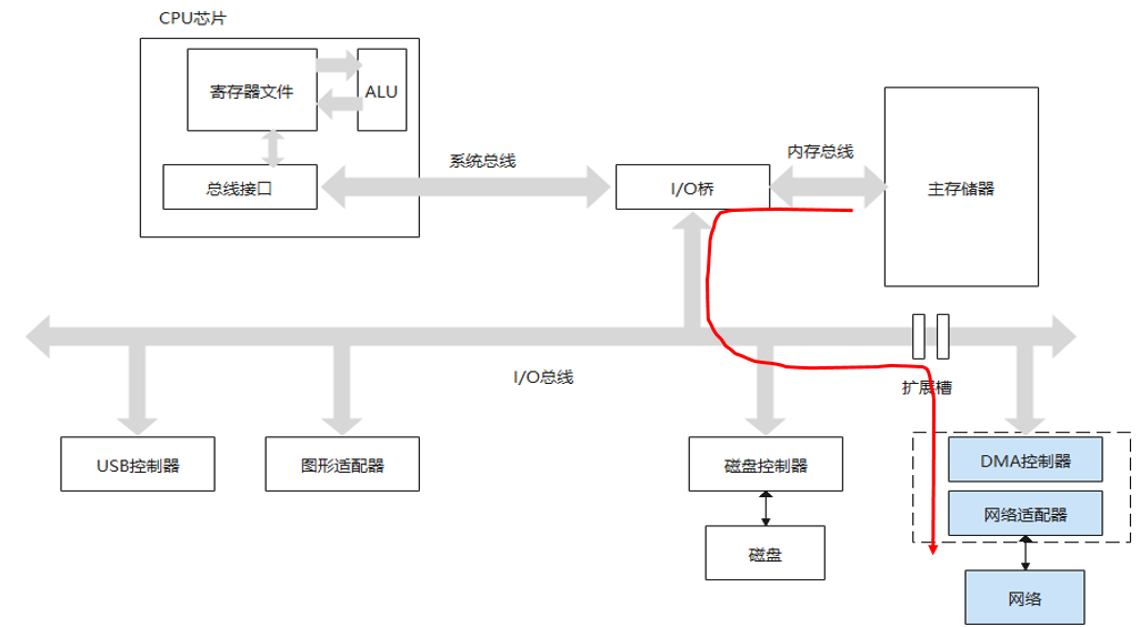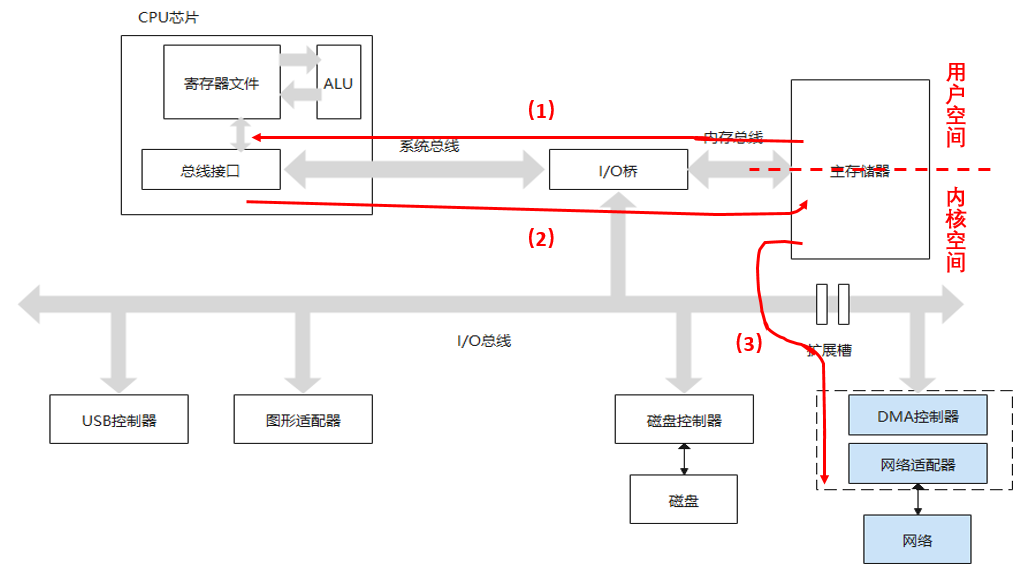 类似的,从网络到内存也需要CPU参与,共经历三个步骤:1、网卡通知CPU数据到达;2、CPU将数据从网卡搬运至CPU寄存器;3、CPU将数据从CPU寄存器搬运至内存。