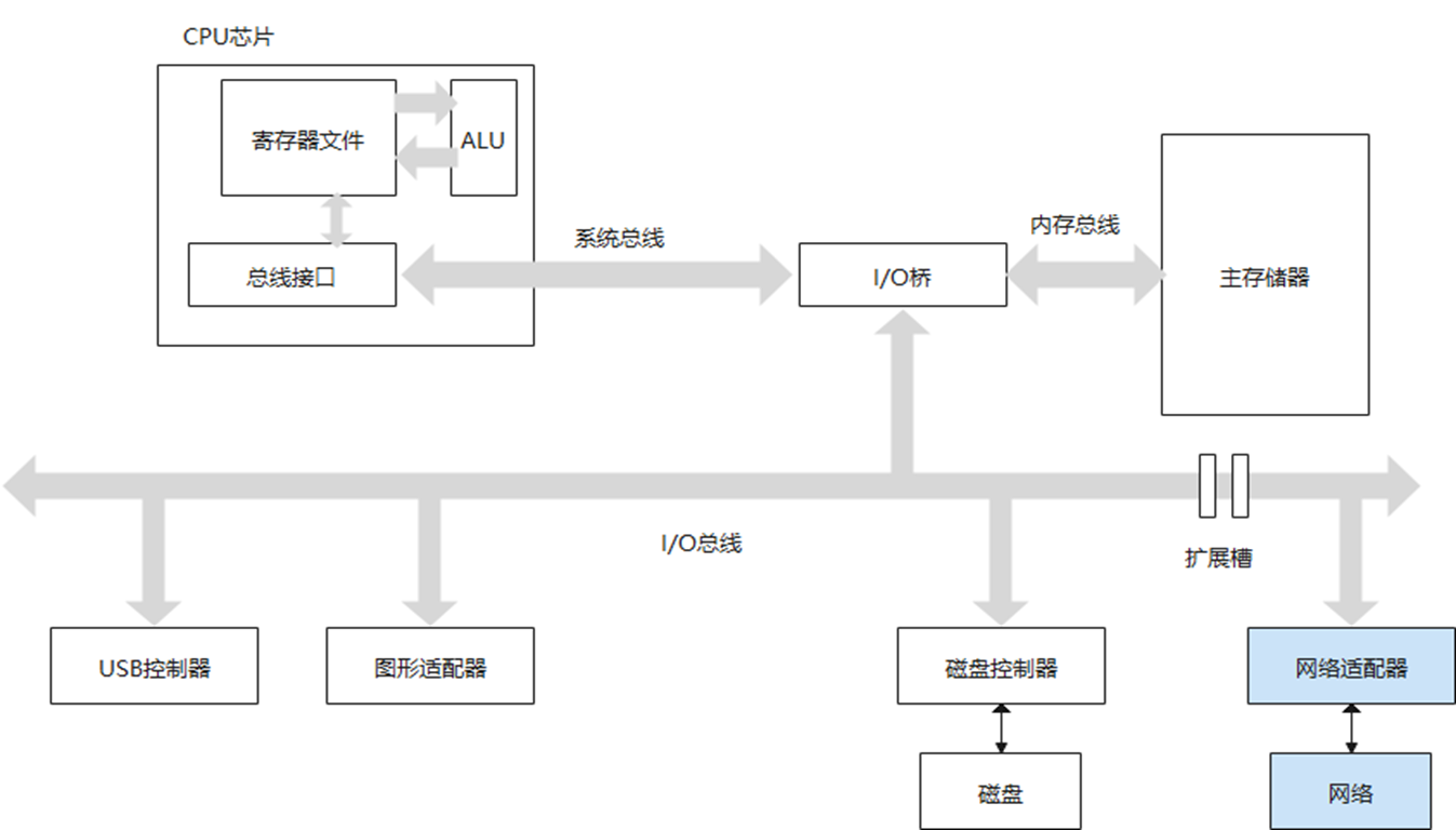 【摘要】 一、计算机系统回顾 & 总线事务计算机操作系统可以看作是CPU、内存、系统总线、和I/O设备的组合,其中,数组通过总线在上述模块中传输的过程称之为总线事务。我们以网络传输举例介绍总线事务,首先是数据从内存->网络。内存传输到网络需要由cpu参与将数据搬运到寄存器中,再由CPU将数据经过系统总线搬运至网络适配器。类似的,从网络到内存也需要CPU参与,共经历三个步骤:1、网卡通知CPU数据到达;...