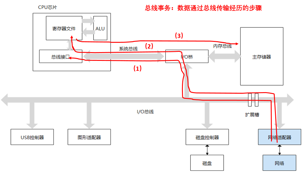 我们以网络传输举例介绍总线事务,首先是数据从内存->网络。内存传输到网络需要由cpu参与将数据搬运到寄存器中,再由CPU将数据经过系统总线搬运至网络适配器。