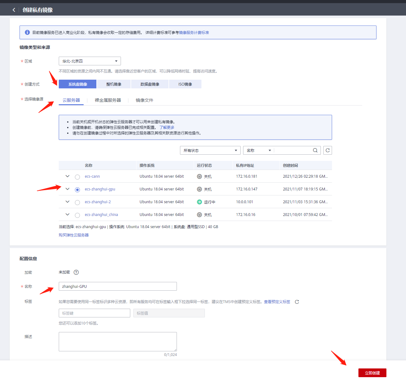 按上图选择 北京四,系统盘镜像,选择自己的云服务器(GPU云服务器),并填入私有镜像的名称 zhanghui-GPU,点击立即创建。