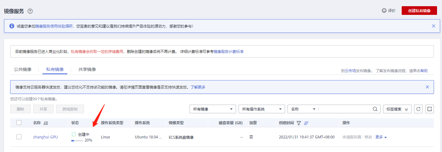 貌似保存私有镜像是免费的,但整机镜像是要收费的。既然这样,就暂时不导出到OBS桶了。反正也不收费。