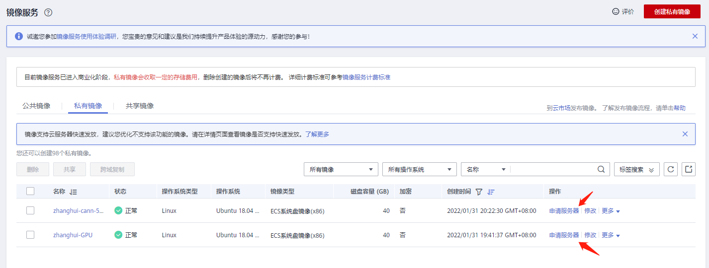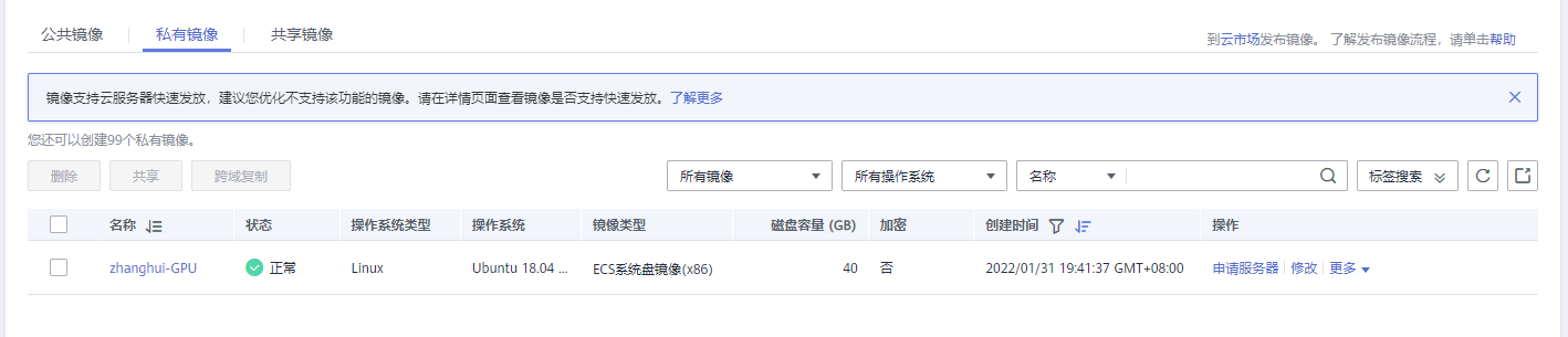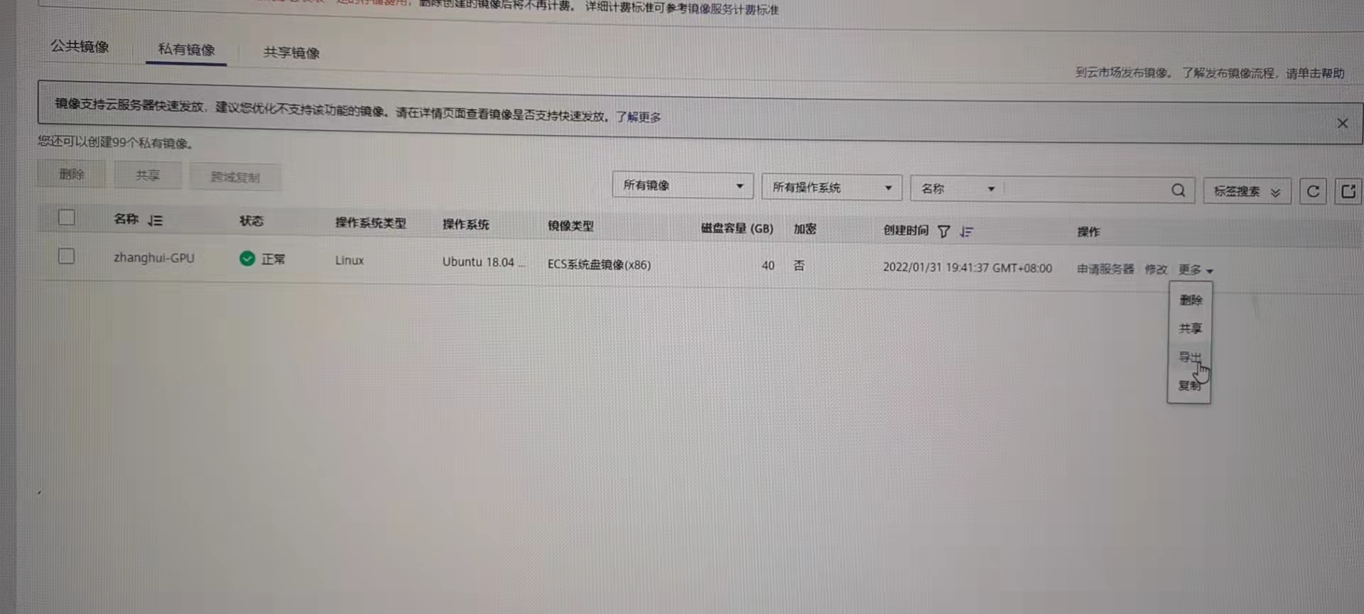 但是这个时候需要注意,申请的服务器的类型最好跟原有的服务器类型一致,比如原来镜像是GPU,那么你申请的服务器也要是GPU。原来镜像是AI1S服务器(AI加速型),那么你申请的服务器类型也要是AI加速型。