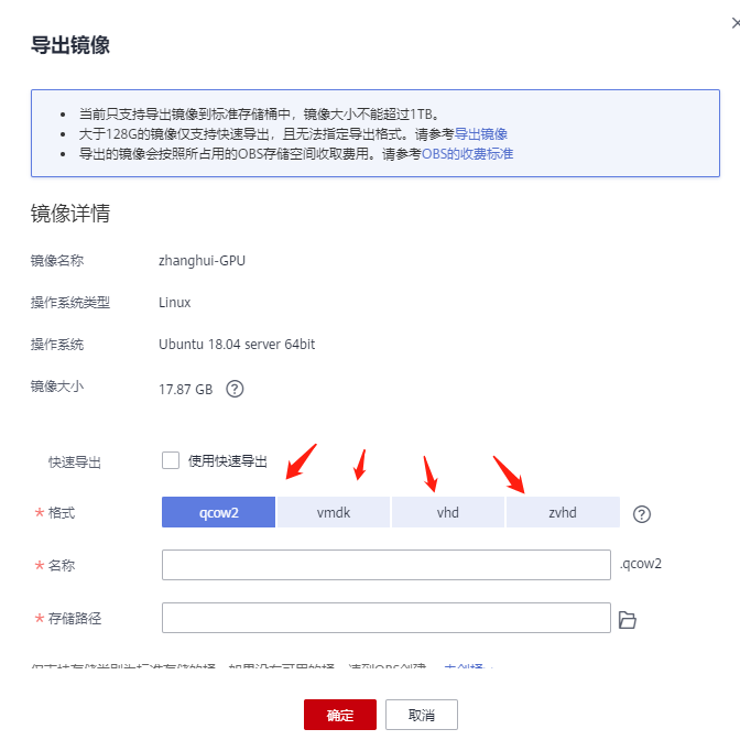 可见这个GPU镜像有17.87G左右,我们可以选择快速导出,也可以选择4种格式的导出。