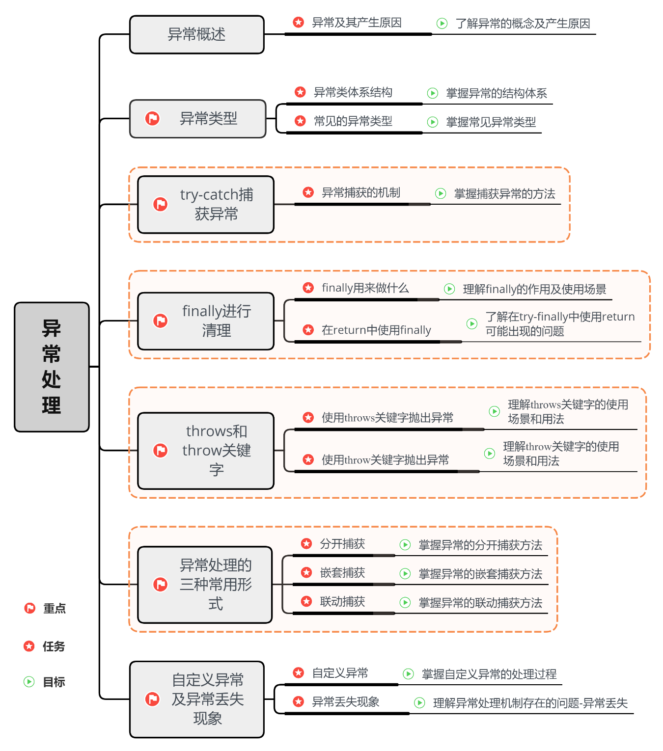 • 如果在当前抛出异常的方法中直接处理异常,可以使用try-catch语句块来进行异常的捕获和处理,也可以通过throws子句将异常抛出给方法调用者,做下一步的处理。