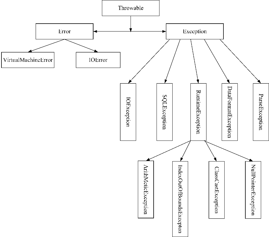 • 异常的基类是Throwable类,派生出的子类分别是Exception类和Error类。