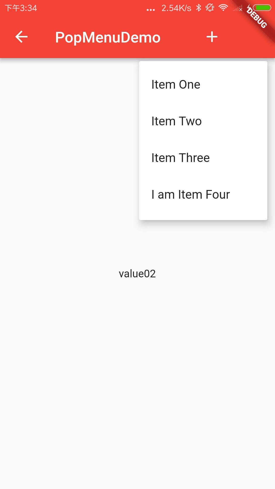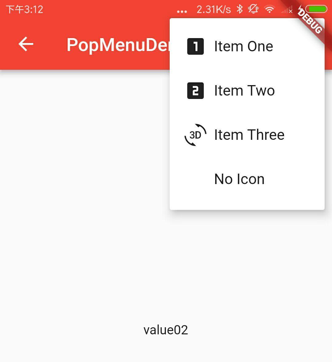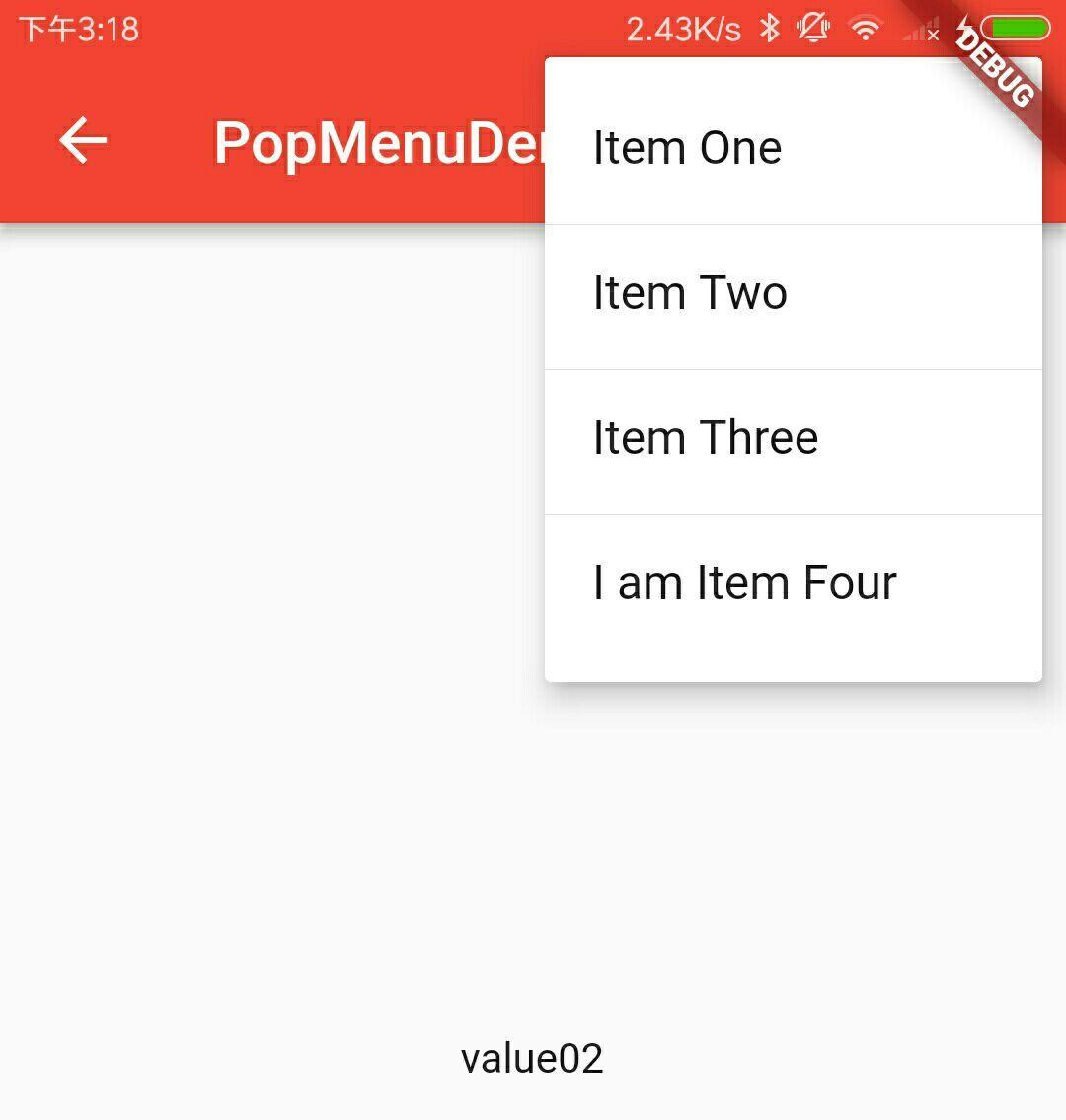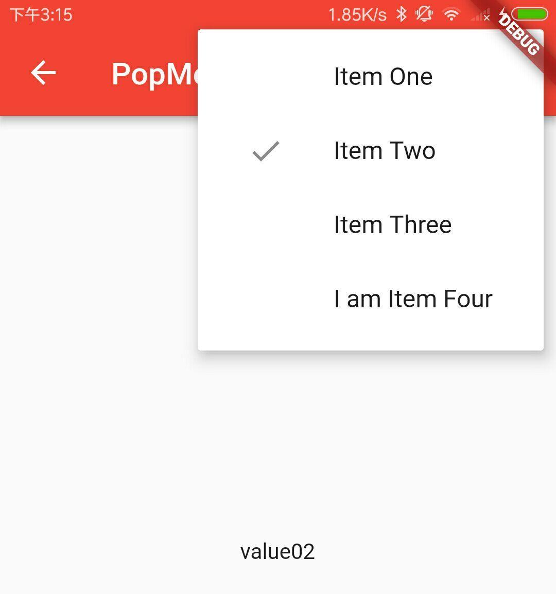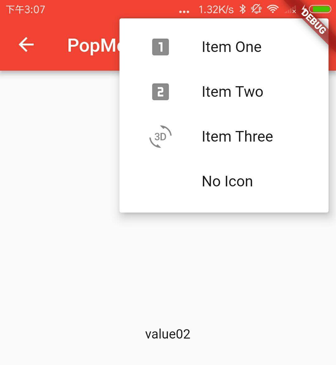 new PopupMenuItem<String>( value: 'value02', child: new Text('Item Two')),