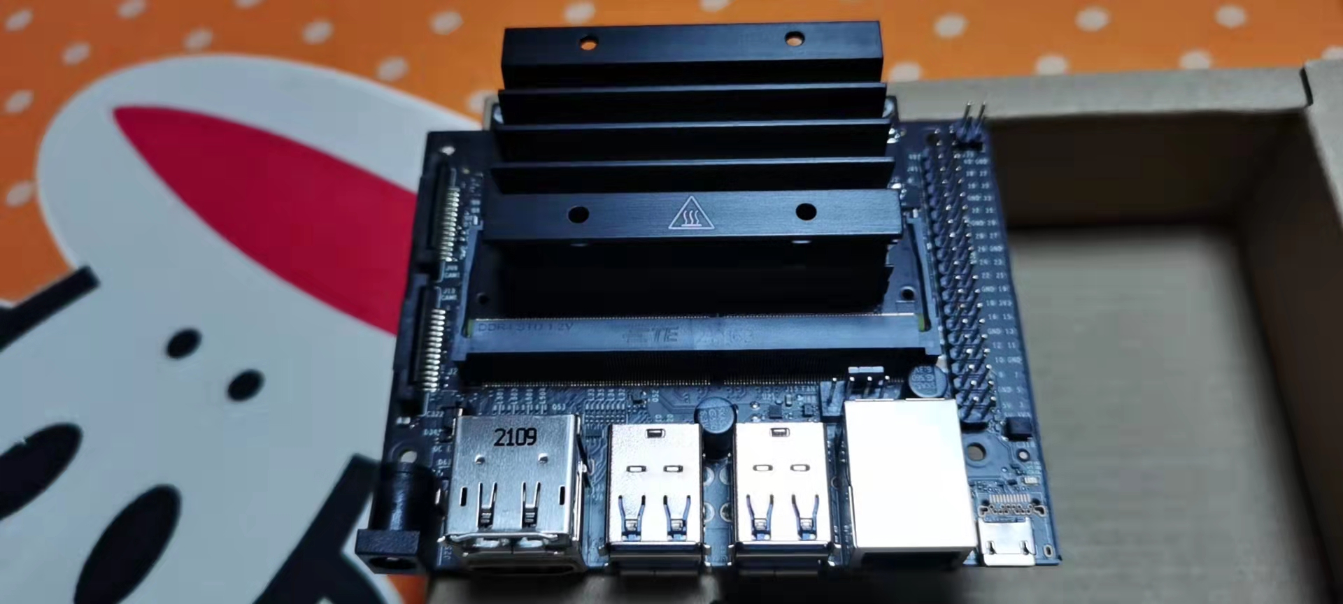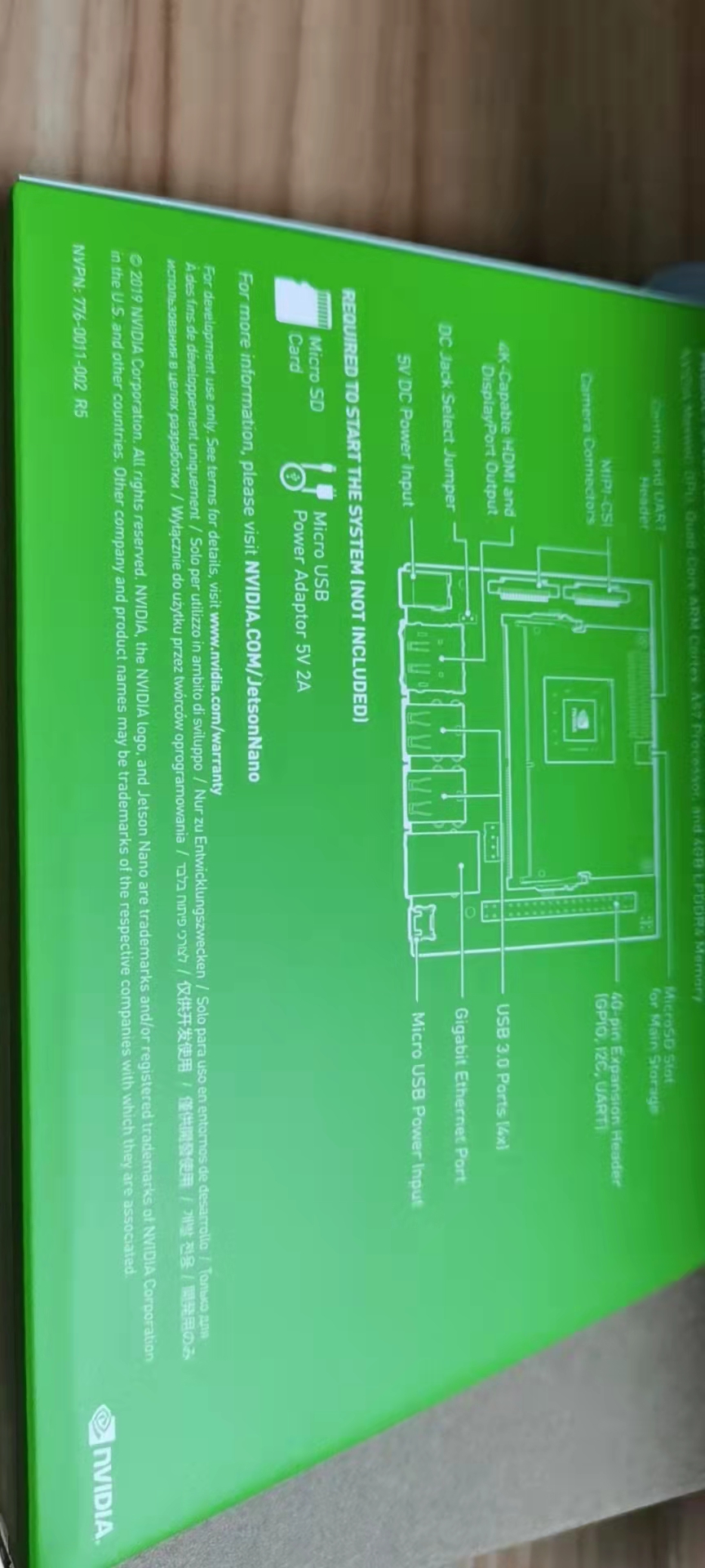 主板正中上面是一个很大的散热片,左边是两个摄像头CSI接口,右边有个40引脚的CPIO,右下角是个5V2A的MicroUSB接口(可以使用电源供电,或者使用PC连接);正下方有1个HDMI 2.0视频接口和1个DisplayPort 1.3视频接口,4个USB3.0接口,一个RJ45千兆以太网接口。左下角是个5V的DC供电口。看视频是推荐使用5V4A的DC供电方式( 使用DC电源需要短接J48跳线帽),因为电源连接这里可以开启15w的高功率模式。据说YoloV3的应用,电流需要2.9A左右,如果连接右下角的电源口,会让Nano板不断地发热和重启。但张小白貌似没有找到这个跳线帽。问了下卖家,他说用MicroUSB做电源应该也没事儿。