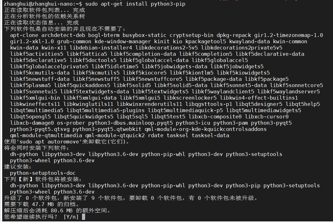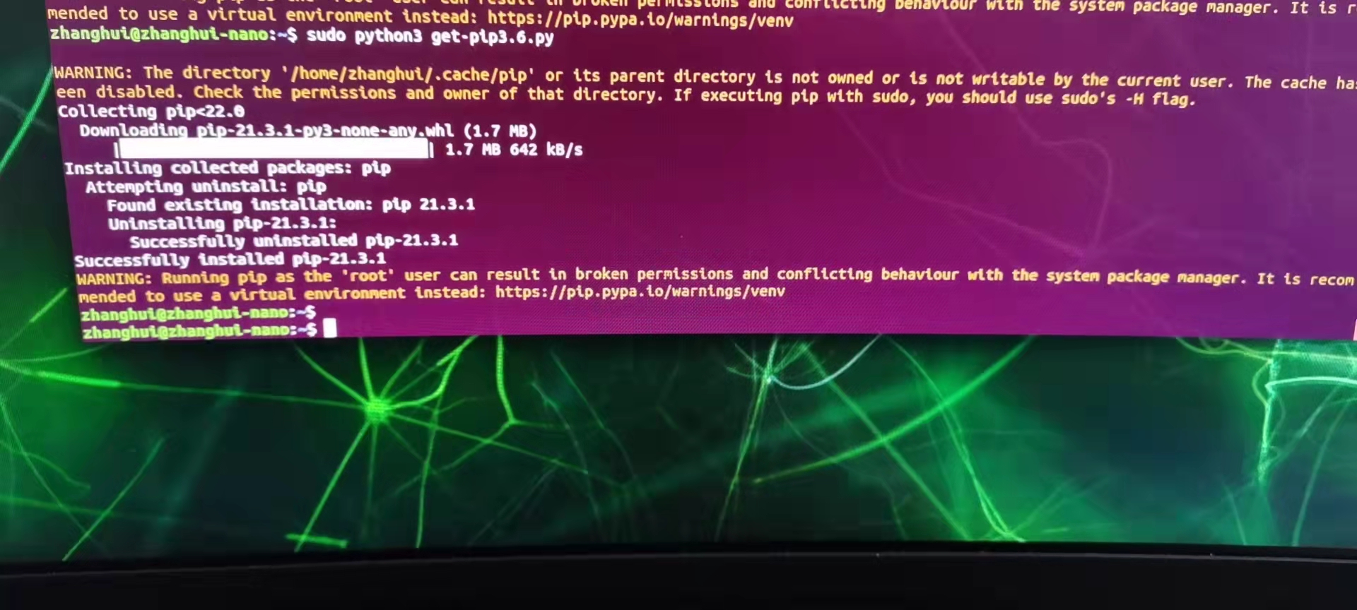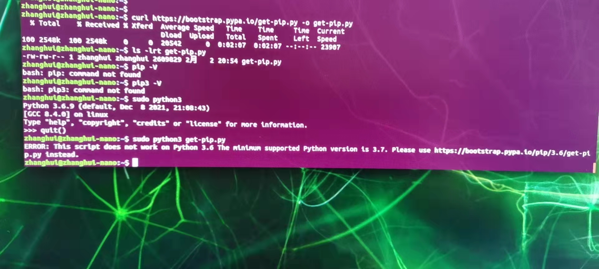 貌似报错了,缺省的Python是3.6.9,get-pip.py需要Python3.7。于是张小白决定暂时不装Python 3.7,而是下载与Python3.6配套的get-pip