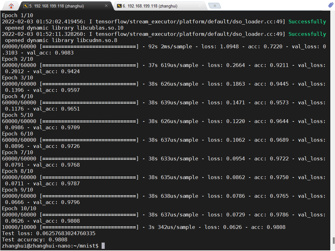 经过了几轮训练,准确率提高到了0.9808,loss降低到了0.0626左右。