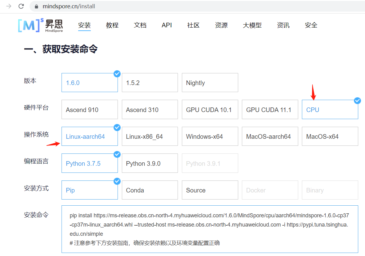 pip install https://ms-release.obs.cn-north-4.myhuaweicloud.com/1.6.0/MindSpore/cpu/aarch64/mindspore-1.6.0-cp39-cp39-linux_aarch64.whl --trusted-host ms-release.obs.cn-north-4.myhuaweicloud.com -i https://pypi.tuna.tsinghua.edu.cn/simple