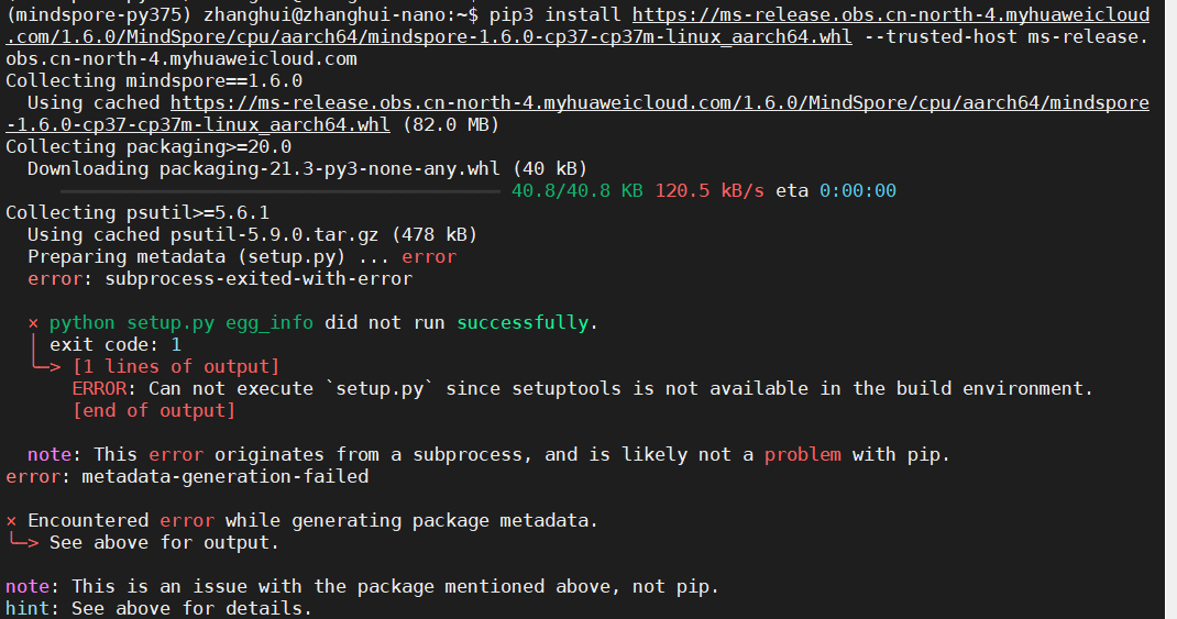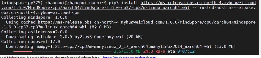 pip3 install https://ms-release.obs.cn-north-4.myhuaweicloud.com/1.6.0/MindSpore/cpu/aarch64/mindspore-1.6.0-cp37-cp37m-linux_aarch64.whl --trusted-host ms-release.obs.cn-north-4.myhuaweicloud.com
