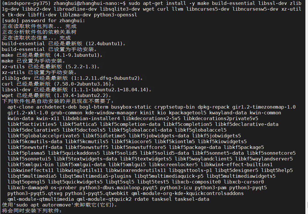 sudo apt-get install -y make build-essential libssl-dev zlib1g-dev libbz2-dev libreadline-dev libsqlite3-dev wget curl llvm libncurses5-dev libncursesw5-dev xz-utils tk-dev libffi-dev liblzma-dev python3-openssl