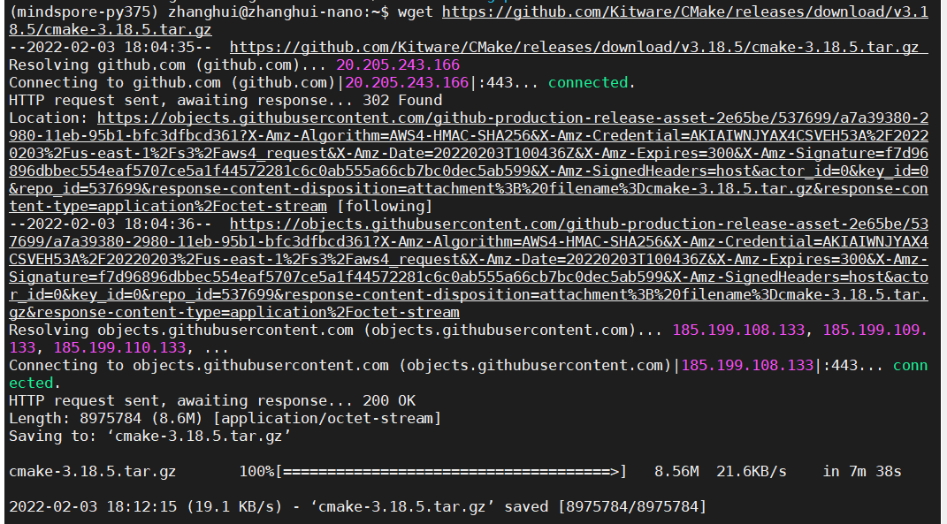 wget https://github.com/Kitware/CMake/releases/download/v3.18.5/cmake-3.18.5.tar.gz