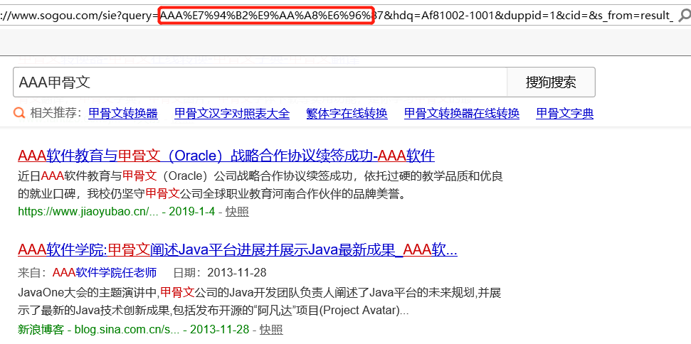 在学习本节知识之前,首先我们要认识一个叫做application/x-www-form-urlencoded MiME的字符串。很多读者看见一串这么长的字符串可能会觉得有点懵,其实这个字符串我们经常见到,只是不知道它什么名字而已,比如在我们使用浏览器进行关键词搜索时,系统会自动将我们所使用的中文转换成特殊字符串,例如图16.3所示,我们在浏览器中搜索‘AAA甲骨文’。