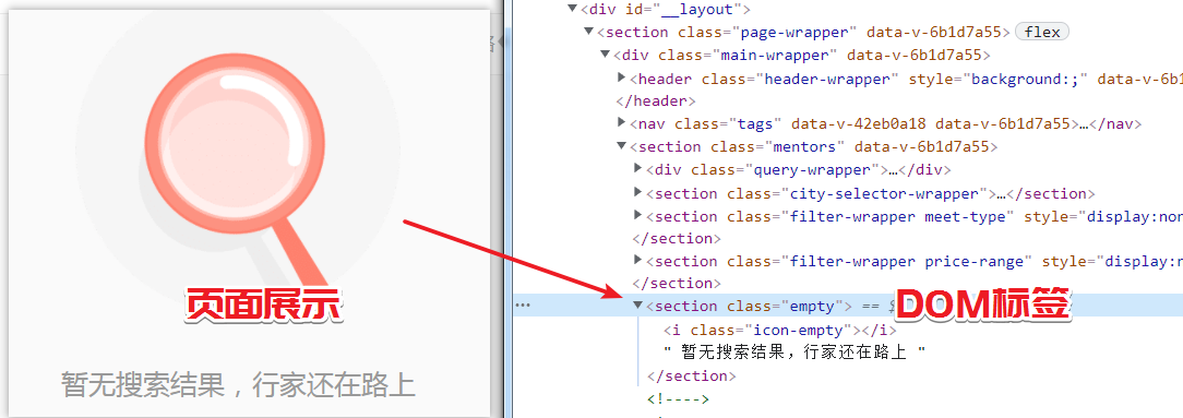 当页码超过最大页数时,返回如下页面状态,所以数据为空状态,只需要判断 是否存在 class=empty 的 section 即可。