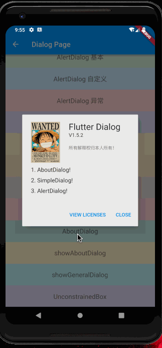 AboutDialog 类似于系统对话框,整体效果我们无法调整,对于主体内容 children 部分,与 SimpleDialog 类似,无法延迟加载模型组件,对于 ListView 等需明确高度;
