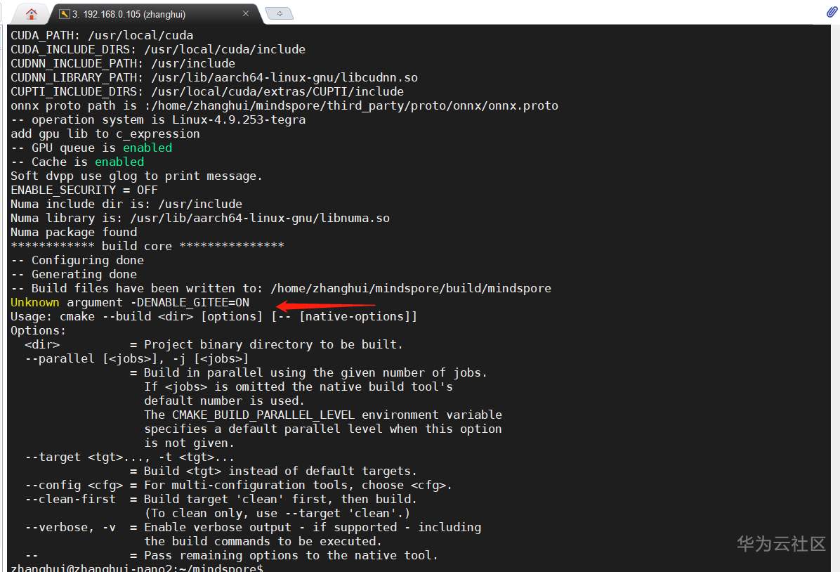 这个已经跑到了build_mindspore.sh中的第二个改动的地方,显然这里是不支持 -DENABLE_GITEE参数,所以果断去掉这个参数,继续编译。。。