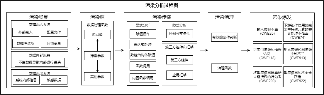 通常外部输入数据都被认为是一种可能引起安全风险的源头,被称为污染源。这些信息被程序的接收或处理函数收到后,在程序内部通过程序内部的各个功能模块被加工、处理或调用某些外部接口执行。这些信息如果未做有效的检验就可能造成各类安全风险。