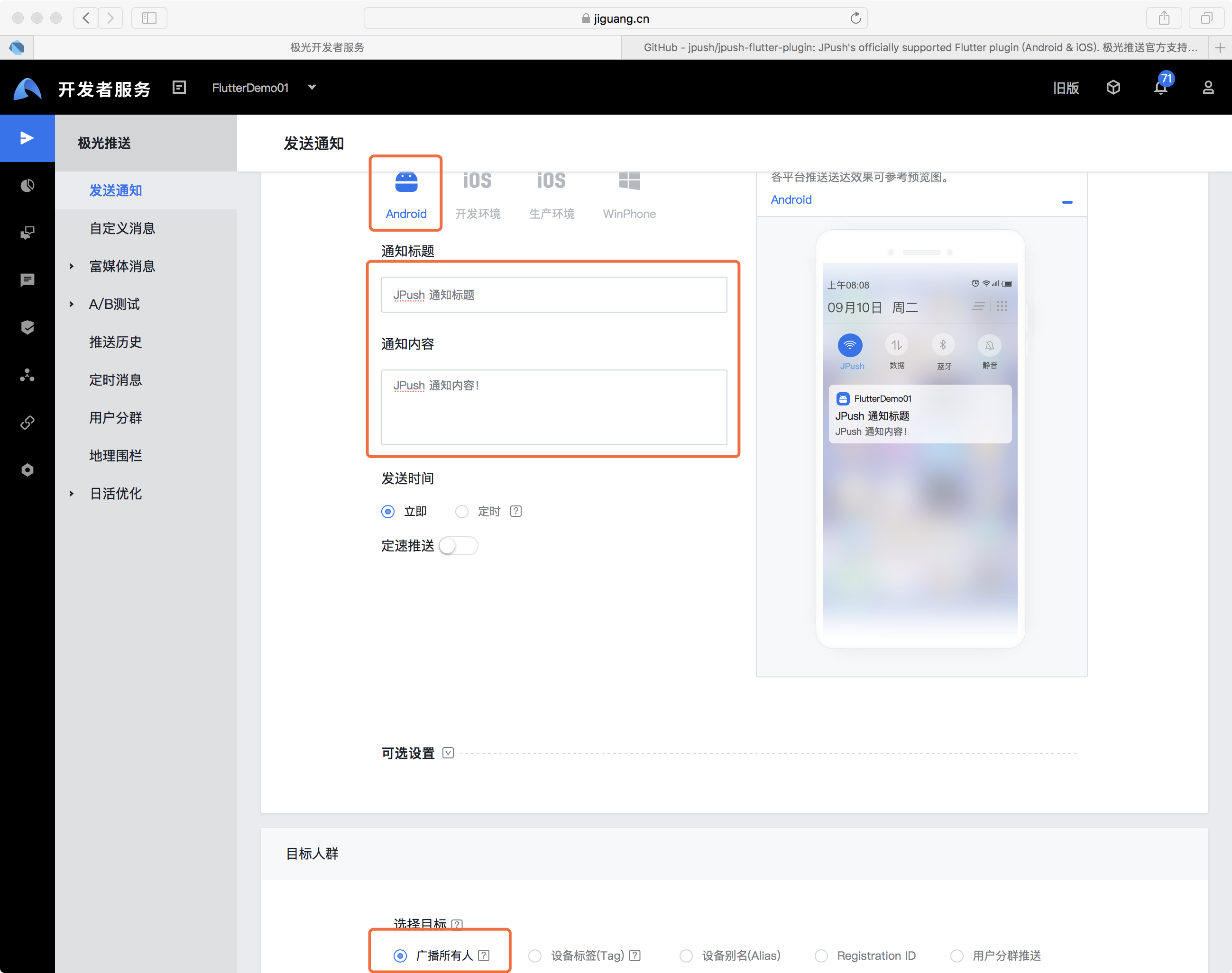 在极光后台【发送通知】中按要求编辑目标平台、通知标题、通知内容、发送时间和选择目标等基本信息;