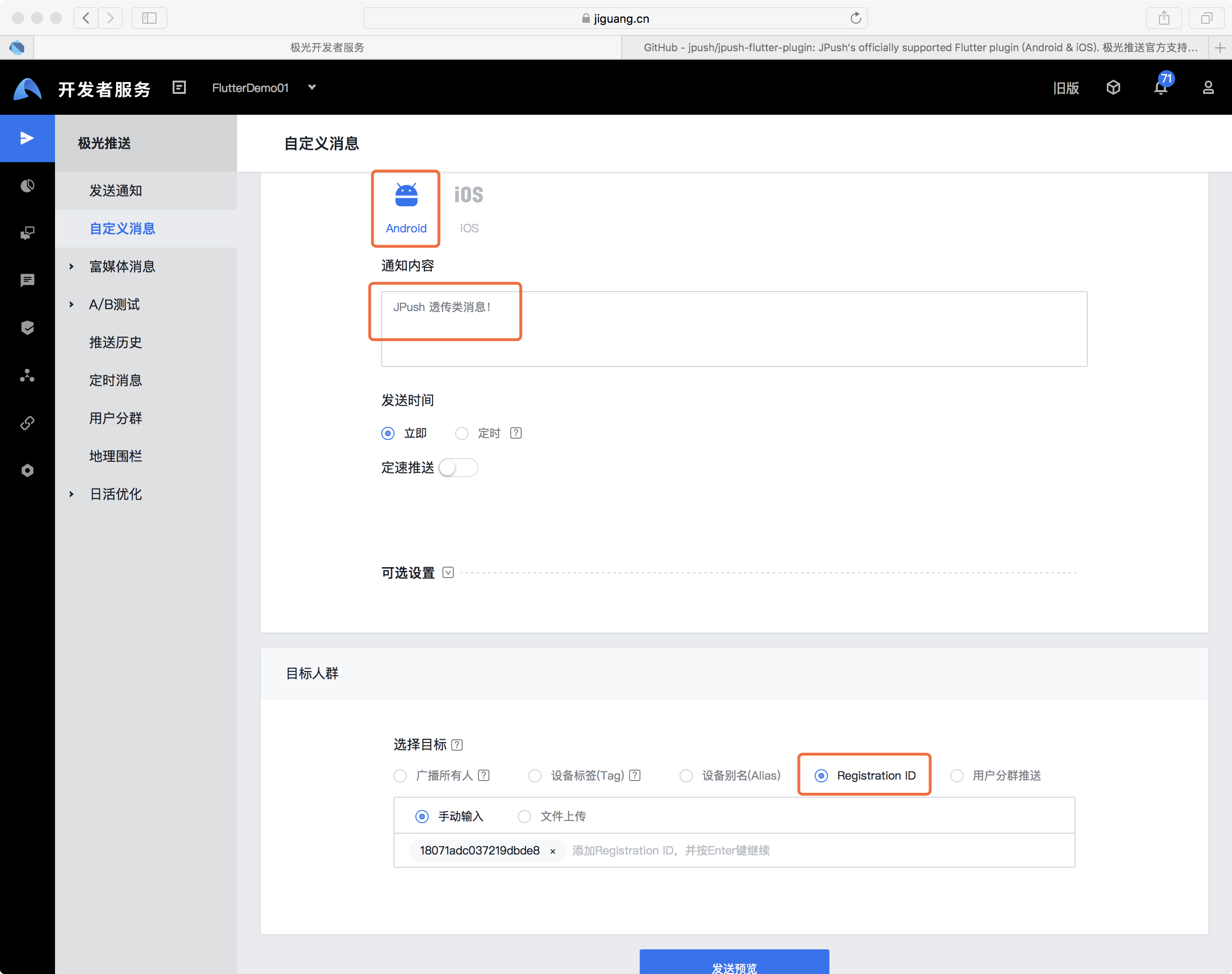 在极光后台【自定义消息】中按要求编辑目标平台、通知内容、发送时间和选择目标等基本信息;其中 Registration ID 为测试时获取的唯一标识;