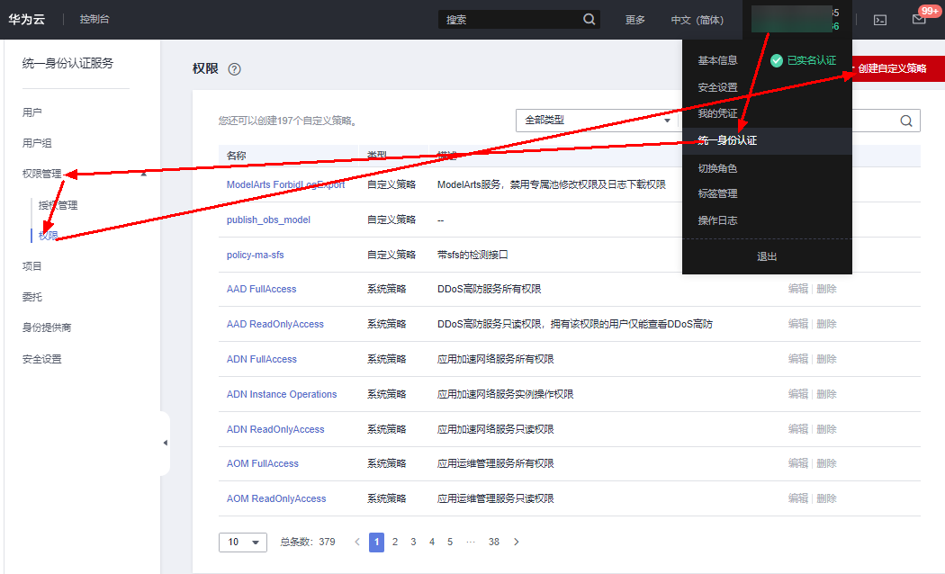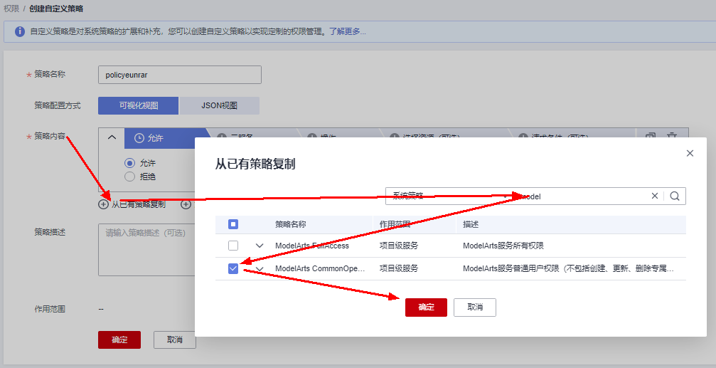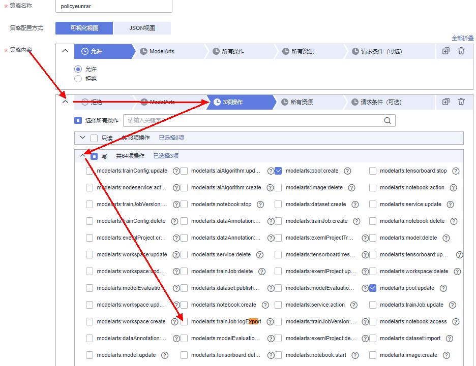 创建自定义策略 ForbidenTrainingLogExport,拒绝 ModelArts 服务下的 modelarts:trainJob:logExport 项。