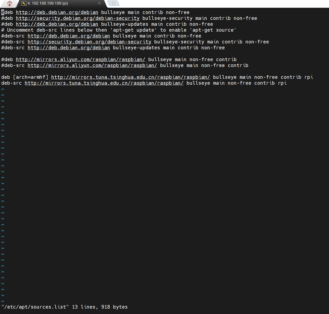 deb [arch=armhf] http://mirrors.tuna.tsinghua.edu.cn/raspbian/raspbian/ bullseye main non-free contrib rpi