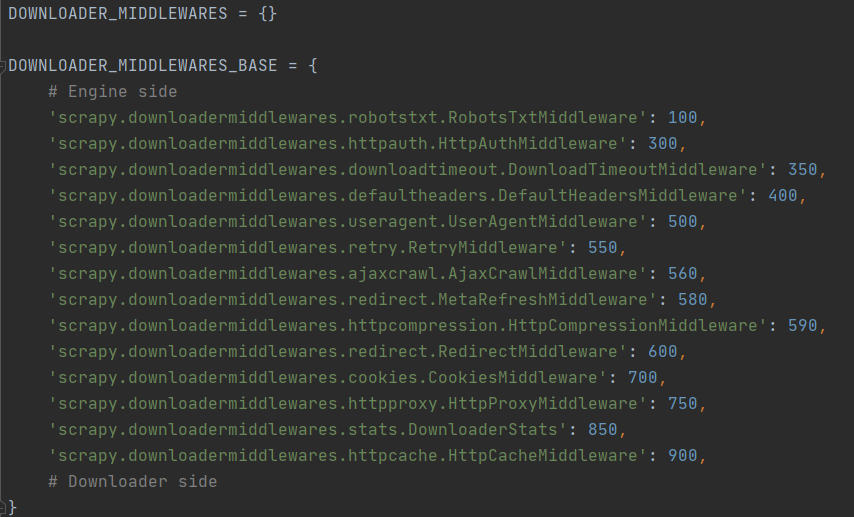 其实 settings.py 文件仅仅是一个 scrapy 项目基础配置,除此之外,在 scrapy 框架中还存在一个 default_settings.py 文件,里面的 DOWNLOADER_MIDDLEWARES_BASE 包含更多下载中间件,而且它们是 scrapy 项目启动之后默认加载的,具体如下图所示。