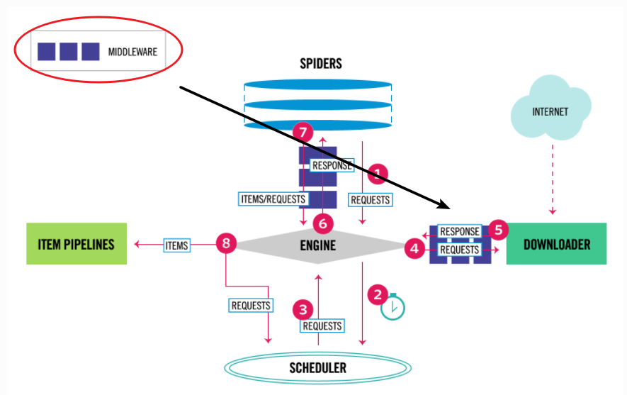 首先看一下中间件在 scrapy 数据流中的位置,下图黑色箭头即下载中间件。