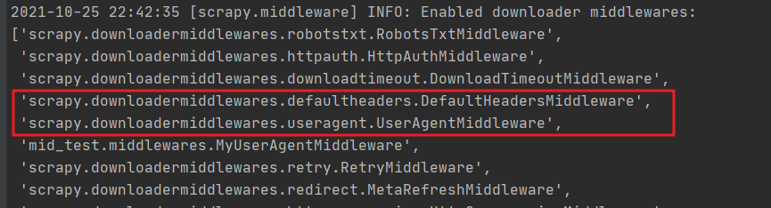 如果没有覆盖原配置,会发现我们编写的中间件优先级不如 UserAgentMiddleware 高,即下图加载顺序。