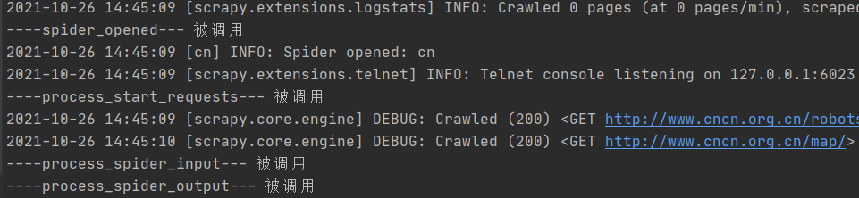 在 middlewares.py 文件中的 CncnSpiderMiddleware 类内部,都增加输出函数,然后运行 scrapy 爬虫,获得如下输出。