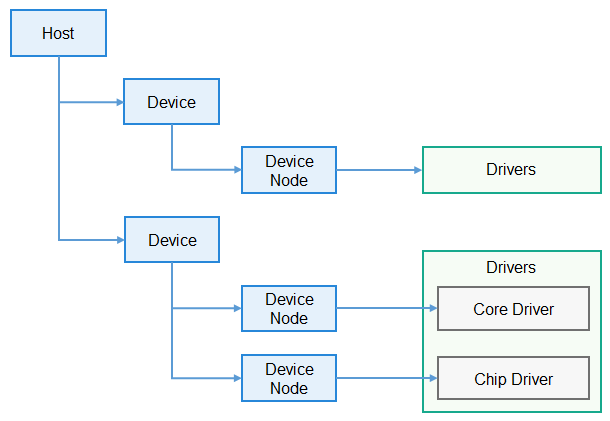 1.1.1.根据HDF框架以组件化的驱动模型作为核心设计思路,HDF框架将一类设备驱动放在同一个host里面,开发者也可以将驱动功能分层独立开发和部署,支持一个驱动多个node,HDF驱动模型如下图
