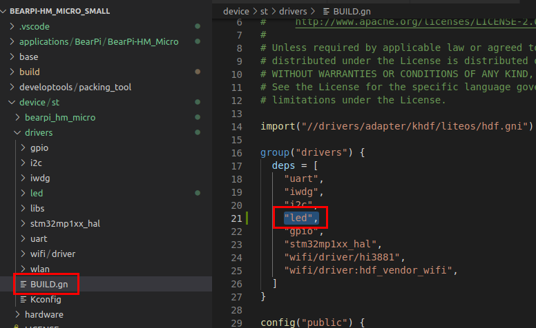 在/device/st/drivers/BUILD.gn文件中添加以下代码,将hdf_led编译进内核,"led"是新增内容