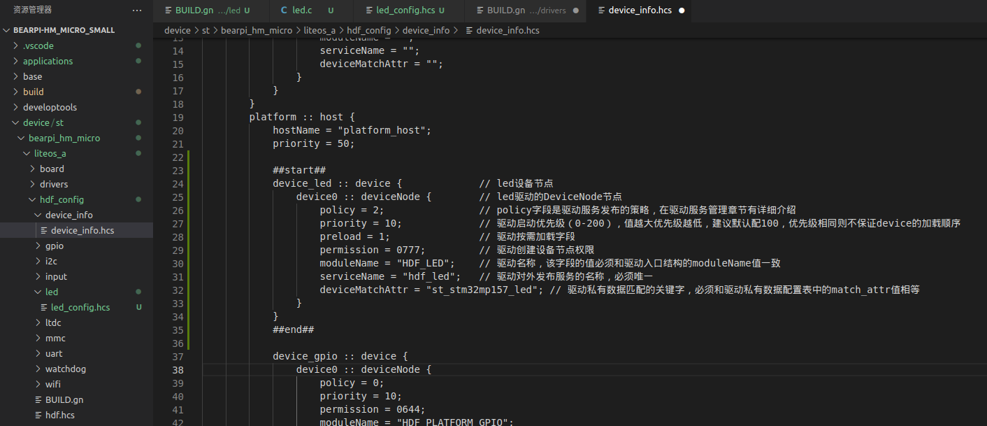 HDF框架加载驱动所需要的信息来源于HDF框架定义的驱动设备描述,因此基于HDF框架开发的驱动必须要在HDF框架定义的device_info.hcs配置文件中添加对应的设备描述,所以我们需要在device\st\bearpi_hm_micro\liteos_a\hdf_config\device_info\device_info.hcs中添加LED设备描述