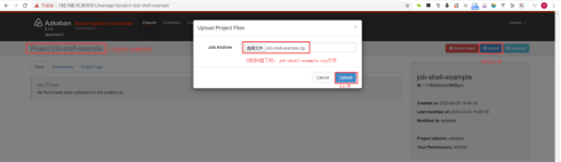 | 这时,在Azkaban的WebUI中,点击浏览按钮,直接选择D盘下的job-shell-example.zip,即可完成上传,如图: |