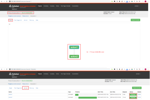 | 当工作流运行完成后,如果所有的节点都是绿色,就表示整个工作流运行成功了。有两种视图的形式,第一种是Graph的形式,第二种是Job List的形式。如下: |