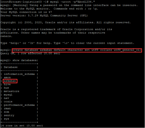 | create database azkaban default character set utf8 collate utf8_general_ci; |