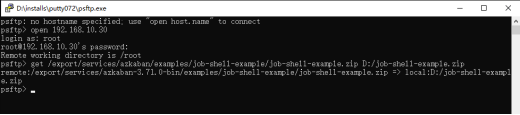| Azkaban的WebUI是在Windows宿主机中打开的,在上传zip包时,只能读取浏览器所在操作系统的硬盘,无法浏览VPS中的zip包。所以还需要将打好的job-shell-example.zip文件使用ftp工具下载到Windows宿主机的D盘根目录下,如图: |