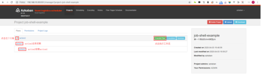 | 上传完成后,页面会以树状结构显示出刚才上传的zip包的每一个job,然后点击Execute Flow按钮即可运行,如图: |